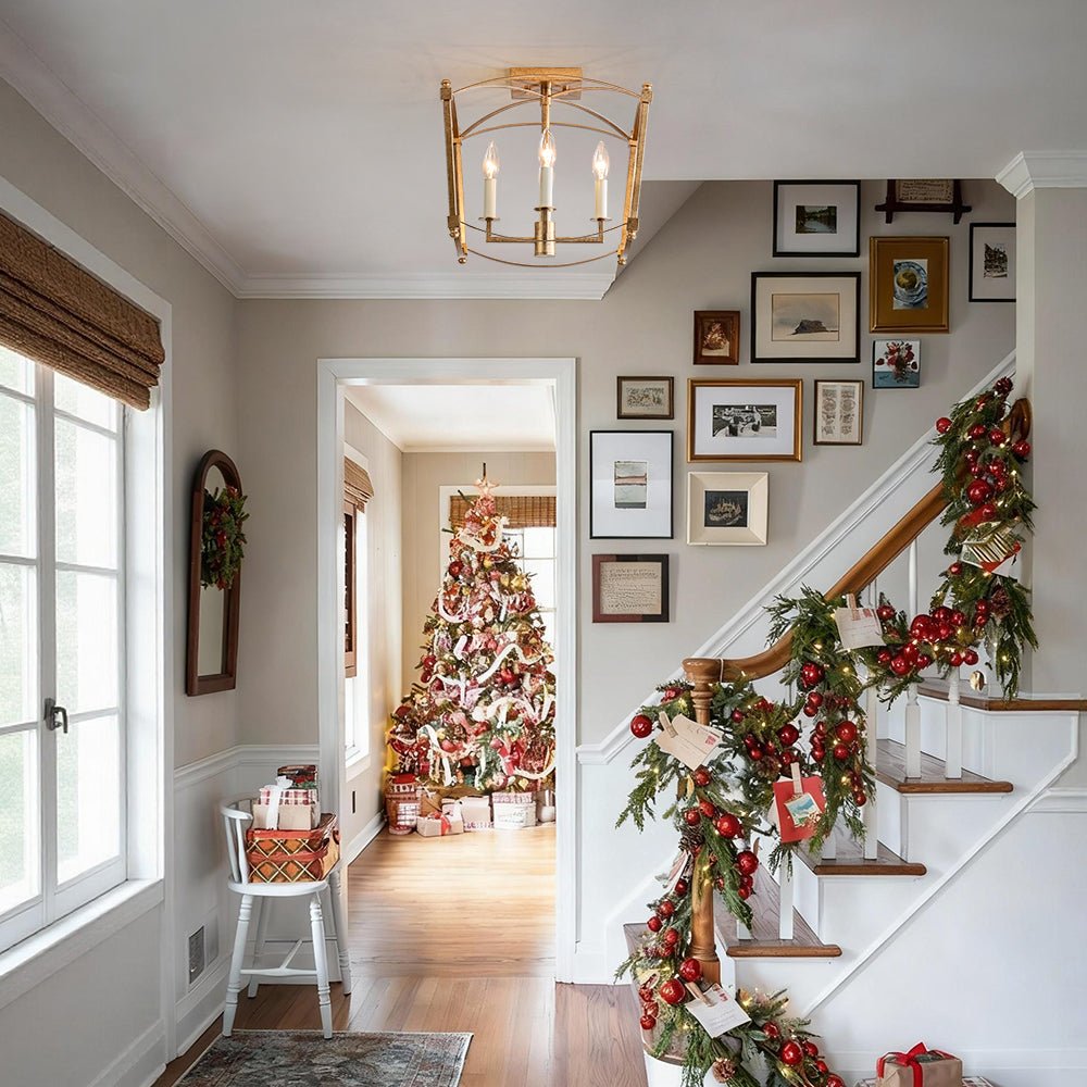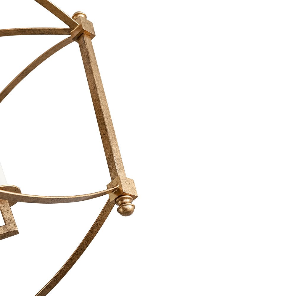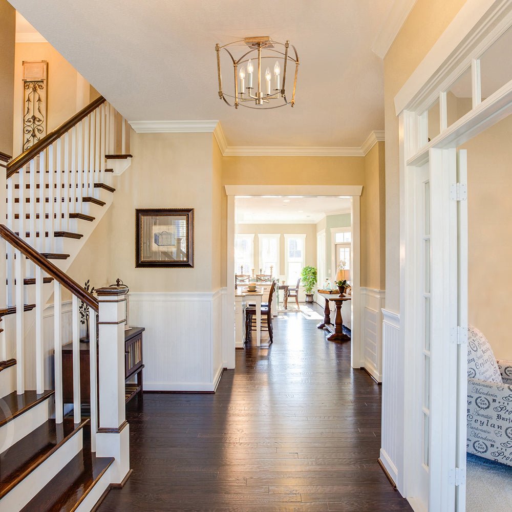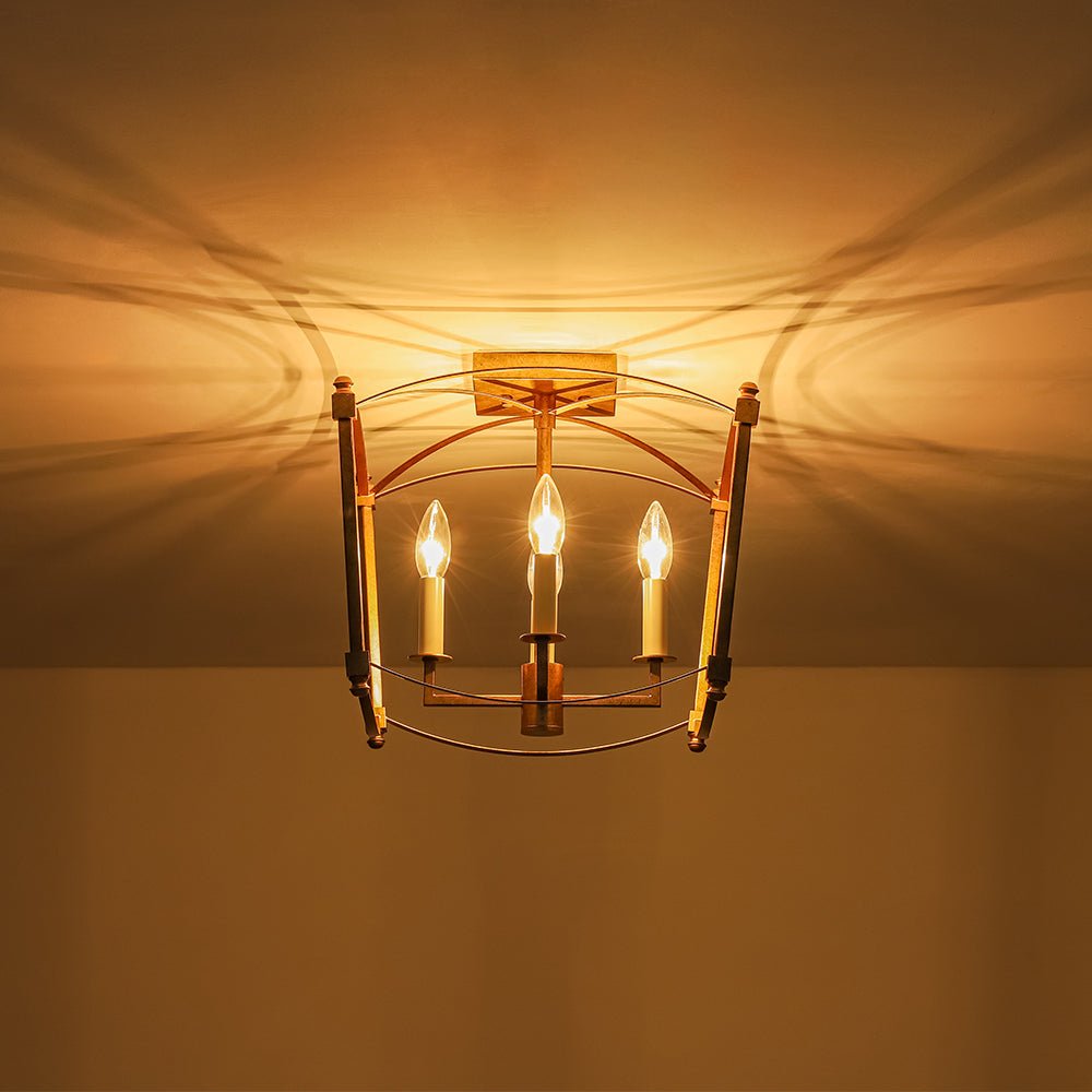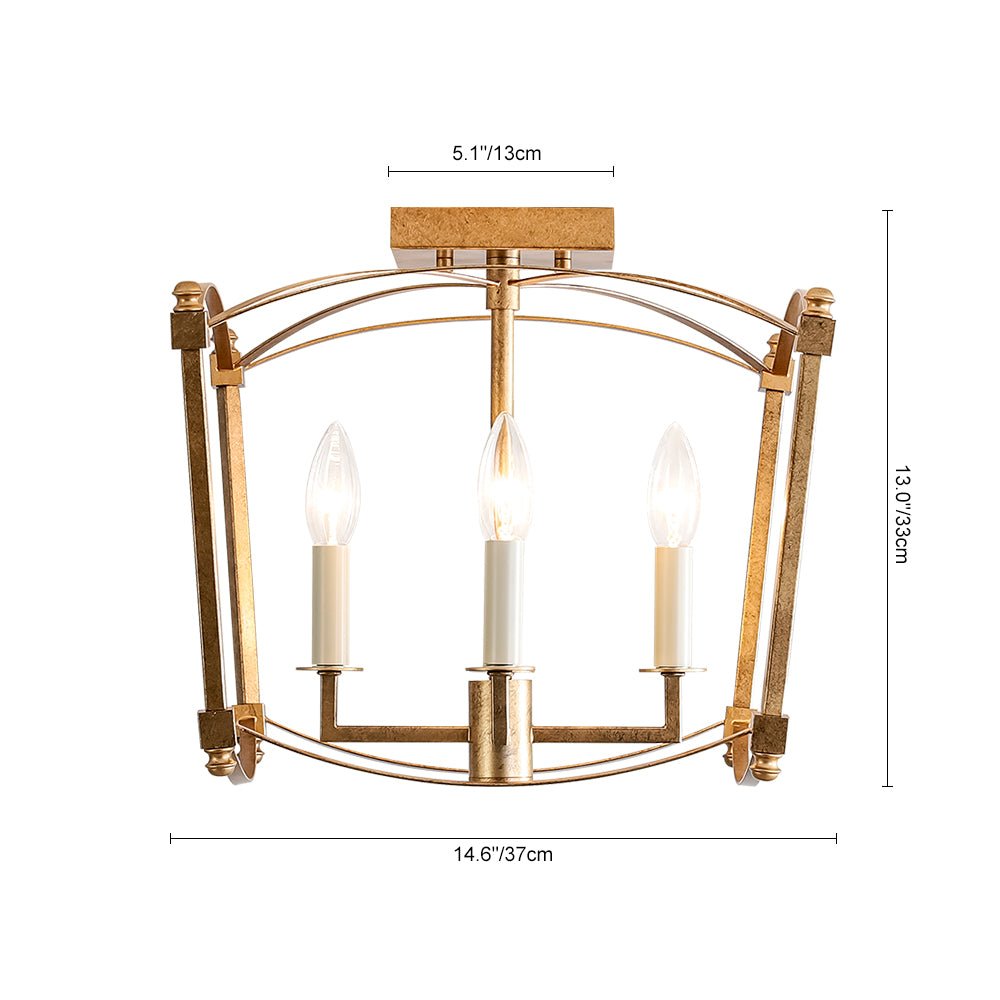 This 4-light semi-flush mount offers abundant ambient light while featuring a minimalist, boxy design that suits both high and low ceilings. Constructed from sturdy metal, the lantern semi-flush mount showcases a slender open frame with graceful, streamlined arched lines, evoking classic French elegance. The fixture houses four candle-style white light holders compatible with E12 candelabra bulbs (sold separately), creating an airy cage-inspired look with a timeless romantic appeal. The distressed gold finish adds a shabby chic charm, while the matte black accents introduce a sleek, modern touch. Perfect to illuminate an entry, dining room, kitchen, bathroom, bedroom, stairwell, or living room, this 4-light candle style ceiling light effortlessly enhances the style of your decor.