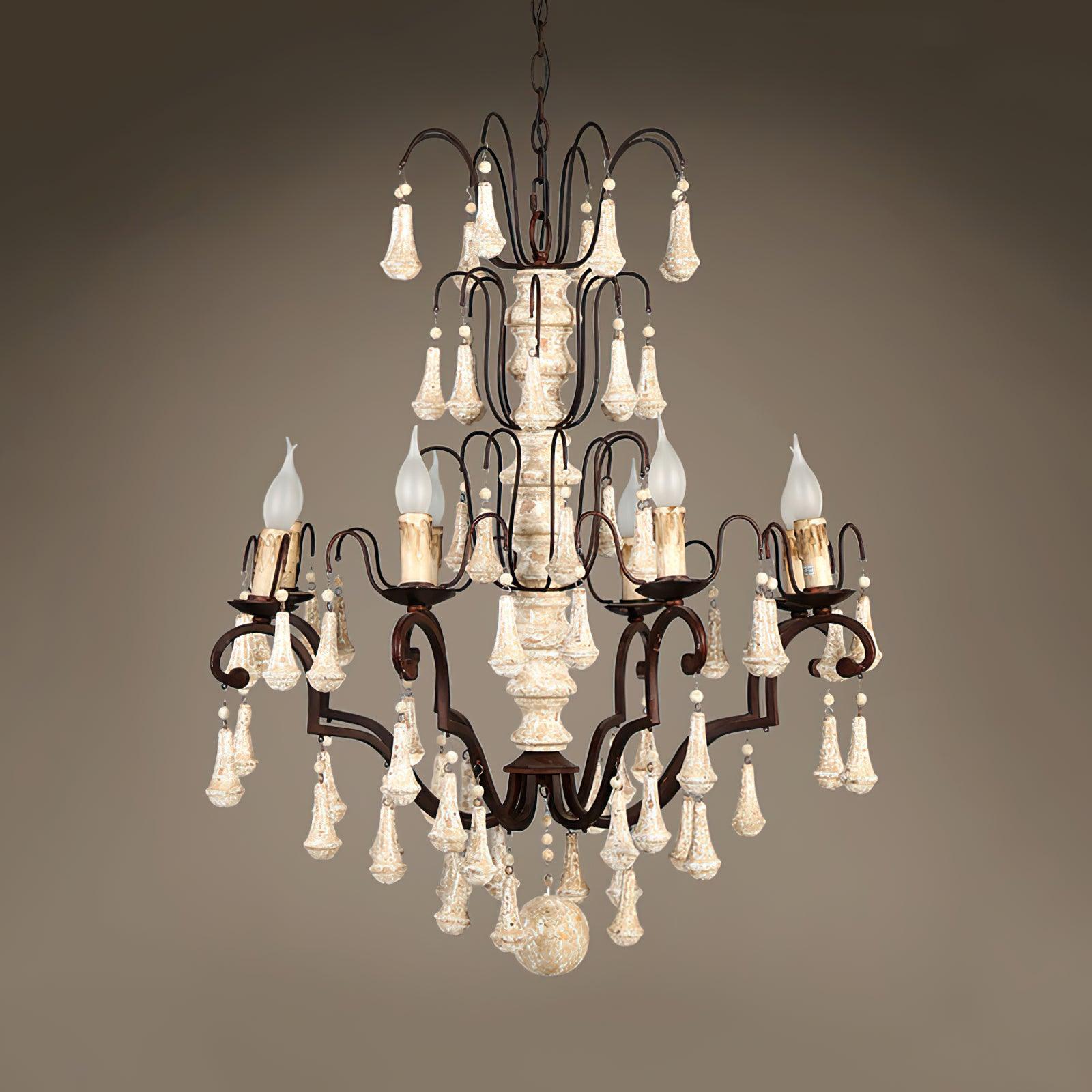 This 8 light pendant is perfect for bringing a feeling of vintage sophistication to your dining room or living room. The classic design features rustic elements like the weathered wood and brown candle holders. With a ribbed long and slender body and suspending beading detail, the many elements provide a feeling of opulence.