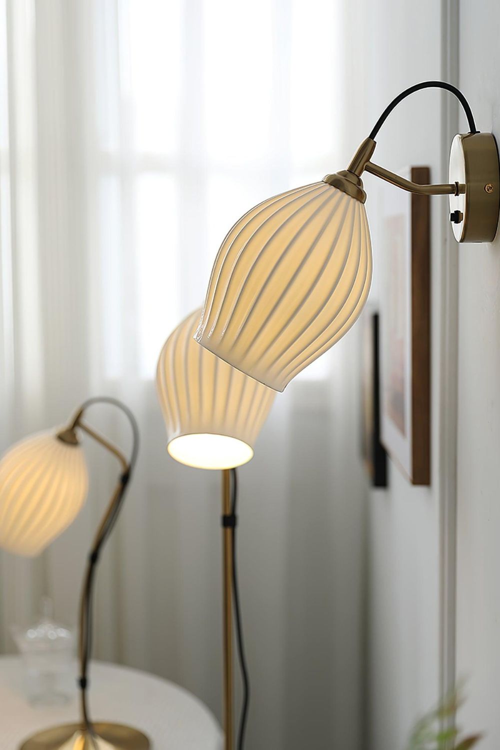 Crafted with a bone china shade, the Ceramic Ribbed Bud Wall Light showcases organic shapes that emit a stunning light when turned on and remain a work of art when turned off. Elevate your space with this unique and sophisticated addition.
