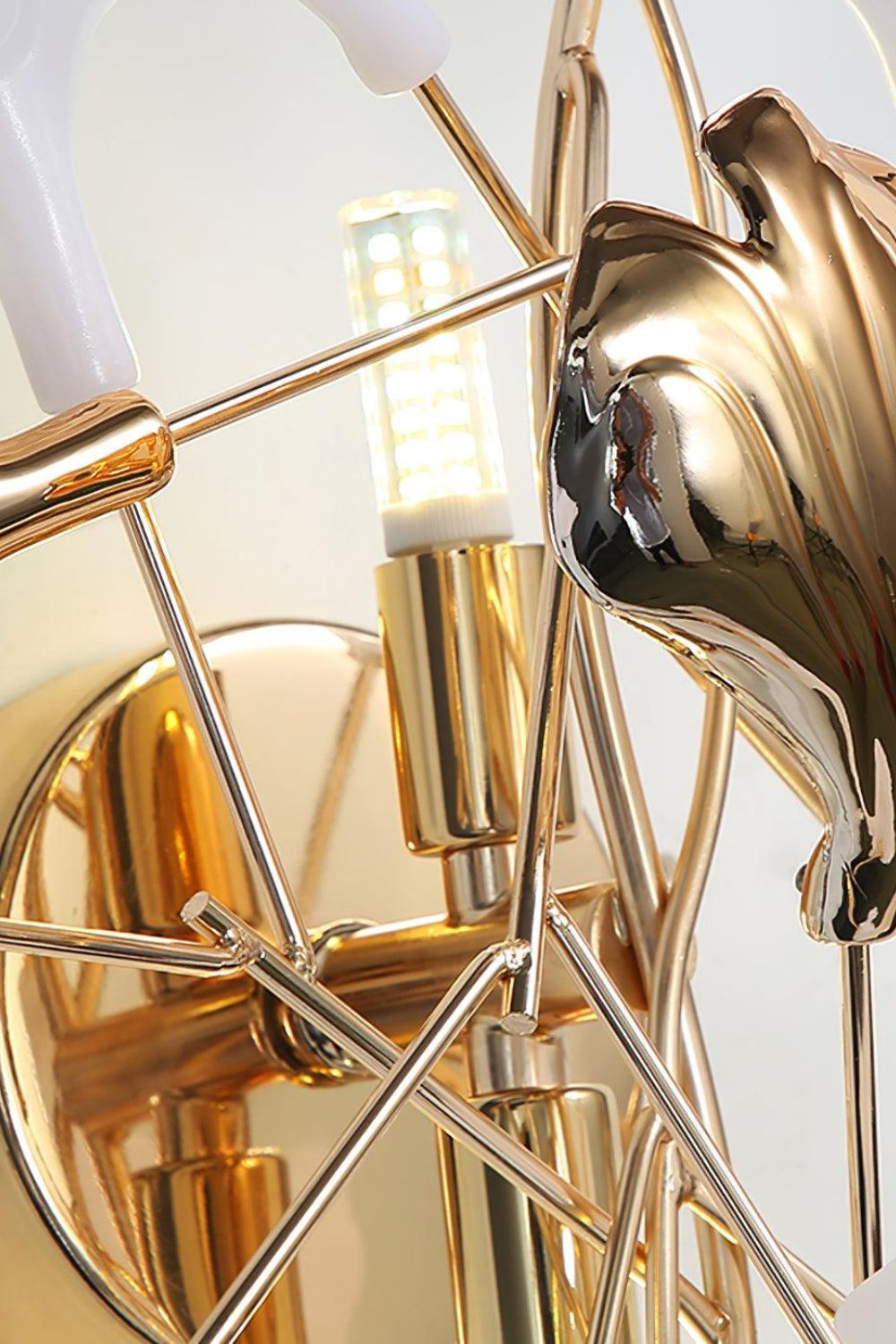 This elegant ginkgo leaf-shaped wall lamp adds a touch of warmth and sophistication to any interior. With its shiny gold and white finish, it serves as a stunning piece of decorative lighting. The Mid Century Sconce design is eye-catching and evenly distributed along the wall. Even when not in use, this sculptural lamp serves as a beautiful addition to any wall, making it a unique alternative to traditional art pieces.
