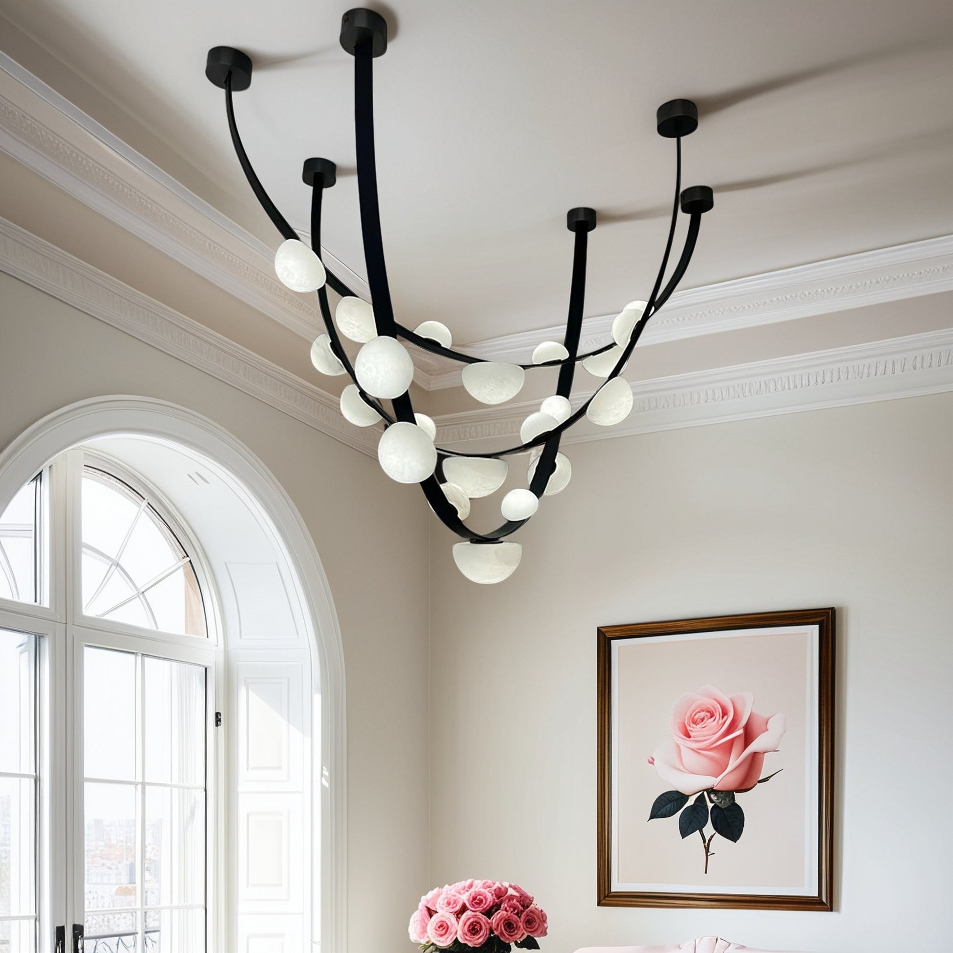 Capture the natural beauty of dew drops with our Dew Drops Alabaster Chandelier. Its intricate details were inspired by the familiar yet captivating shape of dew drops on blades of grass, adding a touch of fascination to any space. Each piece is a stunning work of nature's art.