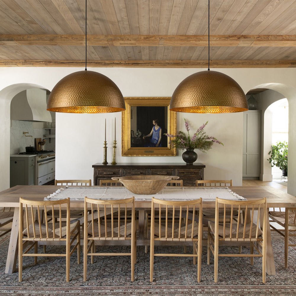 This striking single metal pendant light seamlessly combines a funky industrial aesthetic with a minimalist design, making it a captivating addition to farmhouse, modern, or transitional home decor styles. Crafted with an oversized dome shade, this metal hanging light is adorned with a delicately hammered and hand-crafted texture, boasting a gold leaf interior and an exterior available in aged brass or dark silver. The marriage of industrial and luxurious elements makes this antique oversized hammered dome pendant light an exceptional choice to hang above a kitchen island, dining table, entryway, or any living space, adding a sleek, eye-catching aesthetic to the room.