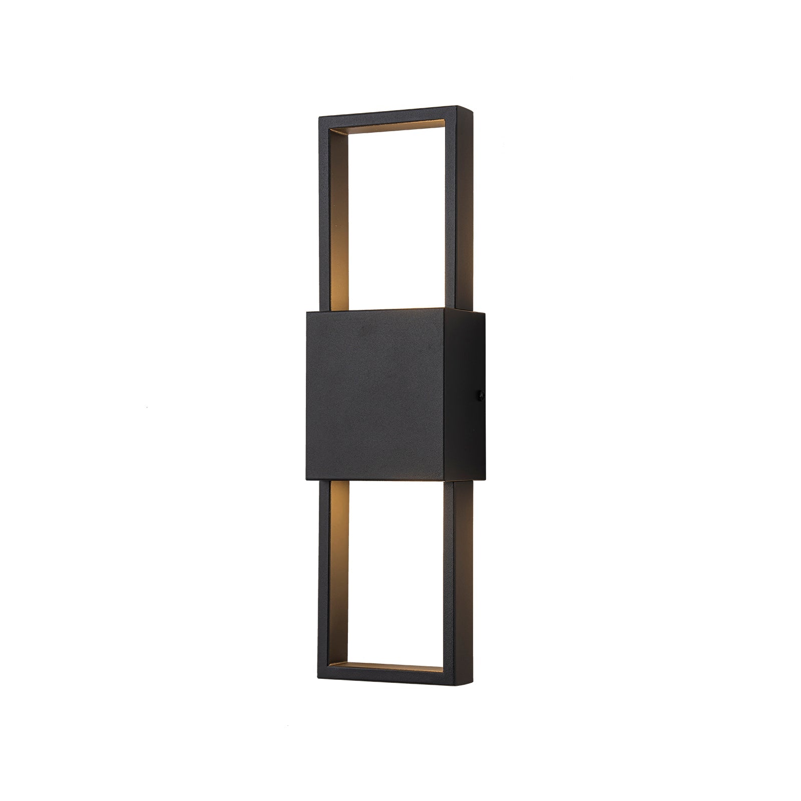 The Rectilinear LED Outdoor Wall Sconce features a sleek 16-inch rectangular design with a matte black finish, offering contemporary elegance for exterior walls. Its dual-head configuration provides soft, ambient light both upward and downward, creating a stylish and inviting atmosphere.