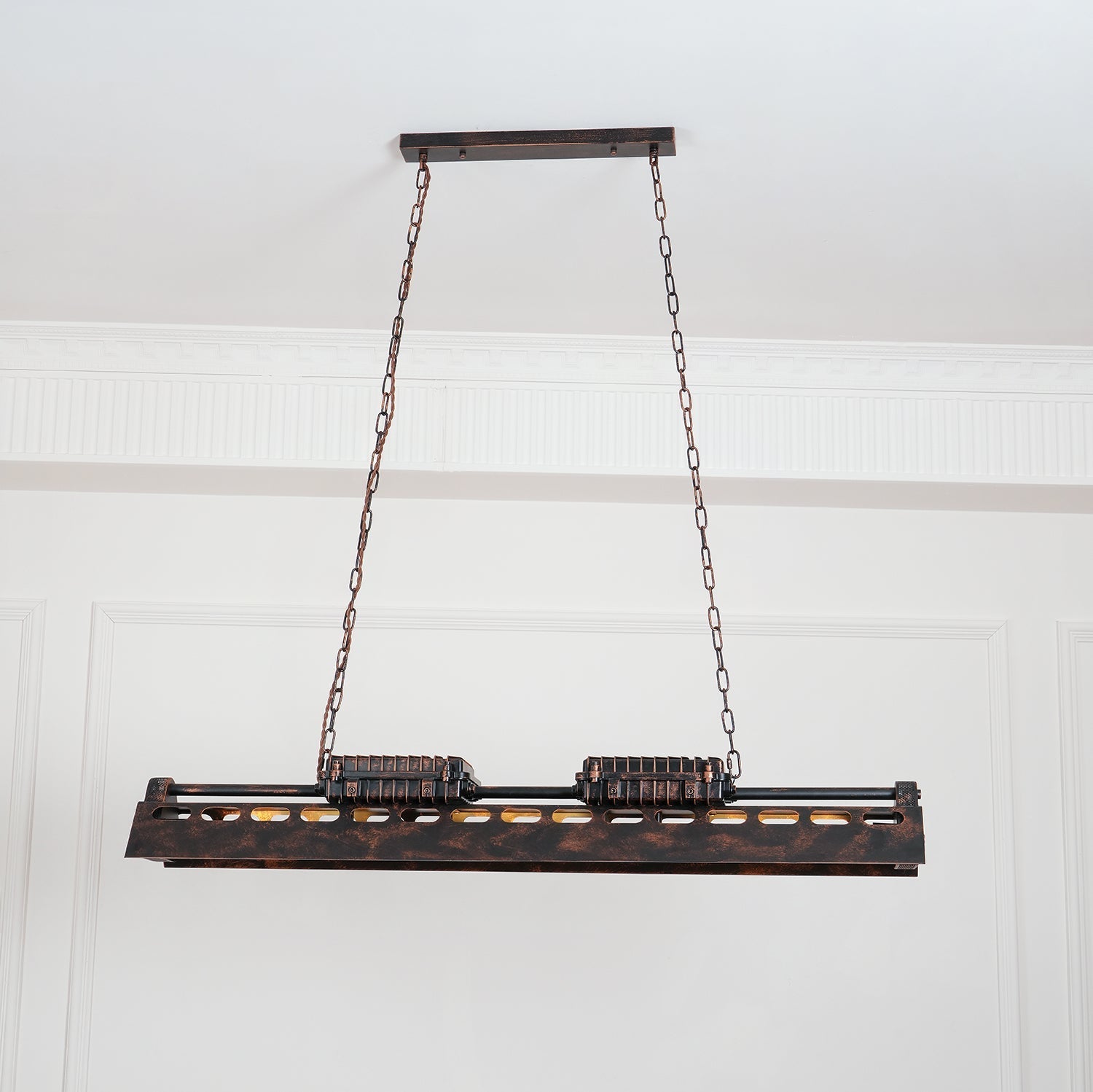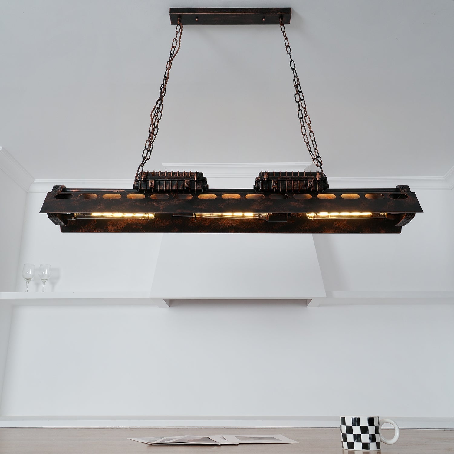 Bringing a sense of sophistication to your home with this pendant light, effortlessly brings vintage elements with industrial styling! Boasting a rectangular metal frame in the rust finish with hollow-out details and a unique box, this chic pendant light introduces an industrial appeal and vintage glamour to your decor. Several Edison bulbs (not included) are underneath the metal frame for bright light, creating a peaceful and pleasing ambiance.